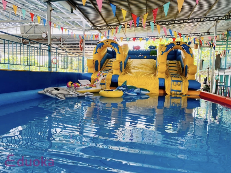 - Khu vực bơi cho trẻ em: Đây là một điểm nhấn đặc biệt của hồ bơi, với mực nước nông, an toàn và có nhiều trò chơi nước thú vị. Khu vực này được thiết kế để các em nhỏ có thể thoải mái vui chơi và tập bơi dưới sự giám sát của nhân viên cứu hộ.