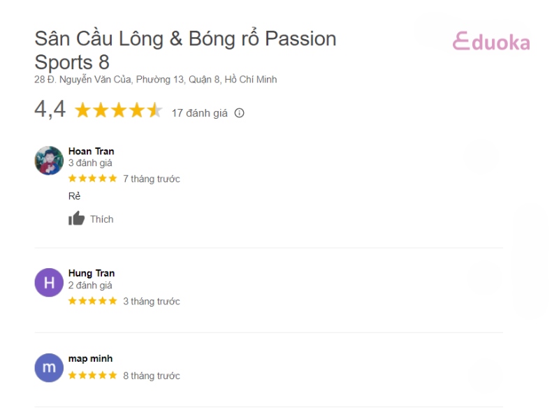 Những người chơi đã từng trải nghiệm tại sân cầu lông Passion Sports 8 đều để lại những đánh giá tích cực. Họ khen ngợi về chất lượng mặt sân, sự chuyên nghiệp trong dịch vụ cũng như an ninh tốt. Một số người chơi còn chia sẻ rằng họ cảm thấy rất thoải mái khi đến đây, không chỉ vì cơ sở vật chất mà còn vì không khí vui tươi, thân thiện.