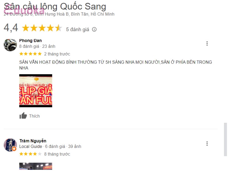 Dưới đây là những trải nghiệm của khách hàng dành cho Sân cầu lông Quốc Sang: